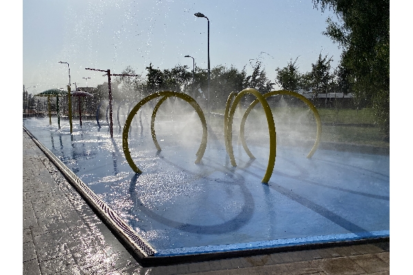 es un juego que genera un pasillo de agua, el cual cuenta con 10 chorros de piso y 10 aspersores mas dos anillos celeste |